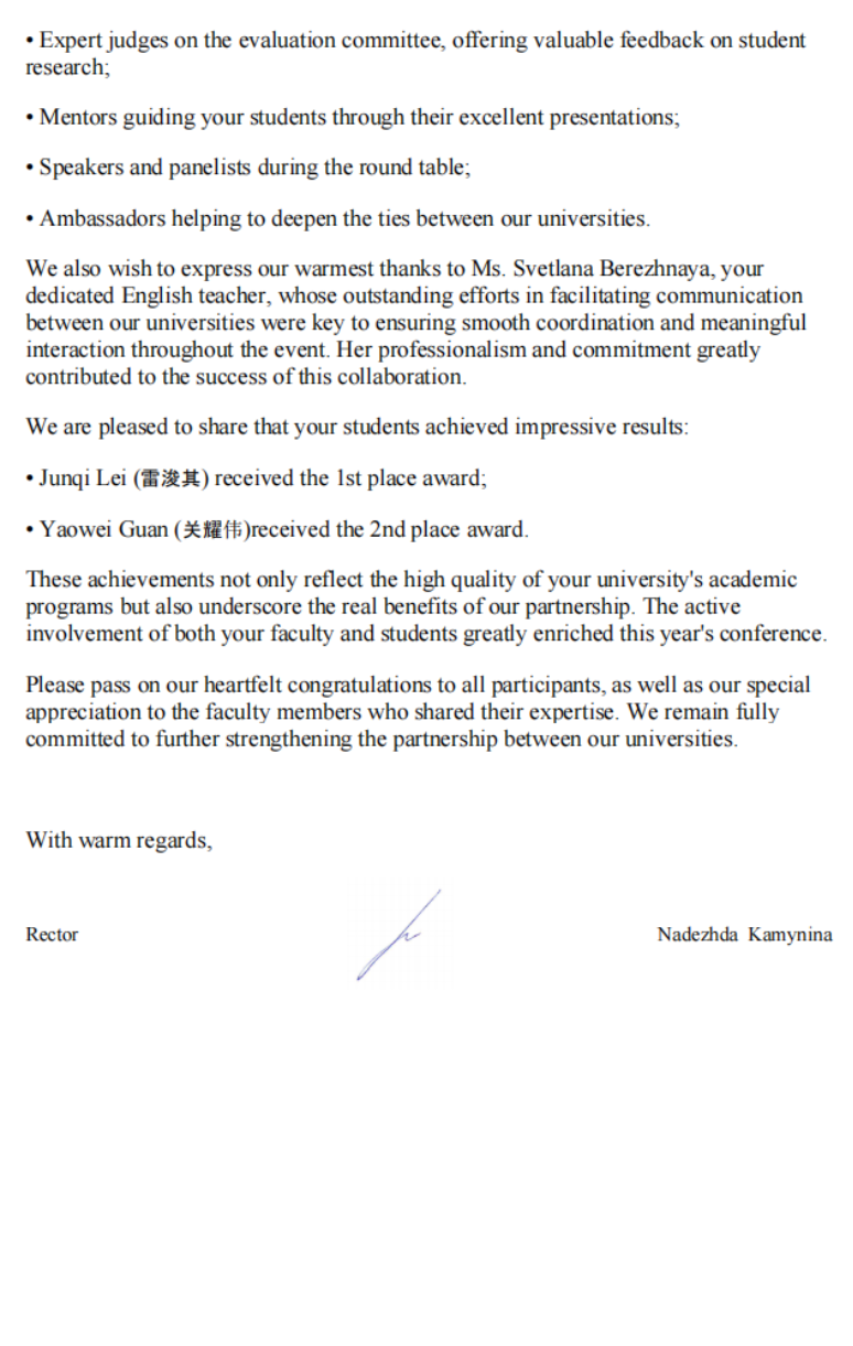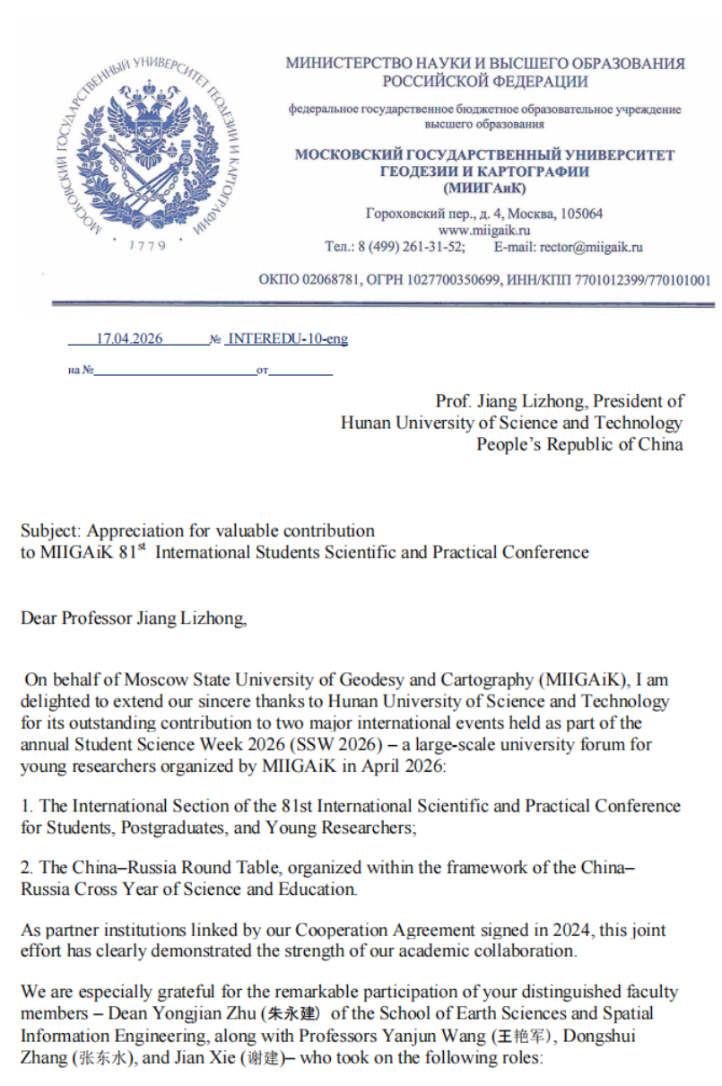 4月15日至16日,湖南科技大学与莫斯科国立测绘大学共同举办了第81届国际科学和实践线上研讨会“the 81st International Scientific and Practical Conference for Students, Postgraduates and Young Researchers, Student Science Week-2026 (SSW-2026)”,中文博彩平台 院长朱永建教授在会上致辞,介绍了湖南科技大学“湖科大二号”卫星发射及学校“一站两中心”建设情况,建议两校在科教融合、人才培养方面开展全面合作。会后,莫斯科国立测绘大学给我校发来感谢祝贺信。