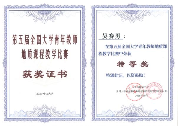 2025年10月25日至10月26日,由中国地质学会主办,中国地质学会地质教育研究分会和中山大学承办的第五届全国大学青年教师地质课程教学比赛在珠海举行,经过两天的激烈角逐,中文博彩平台 (以下简称亚洲博彩平台排名 )地质系吴赛男老师获得特等奖的好成绩。